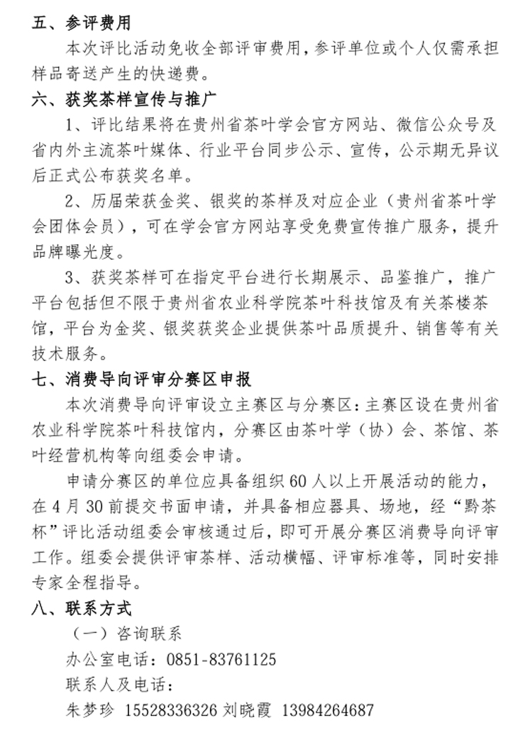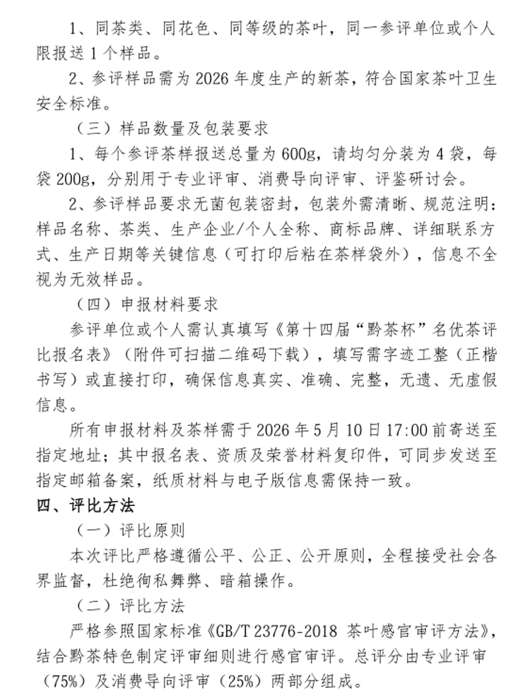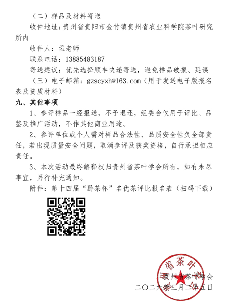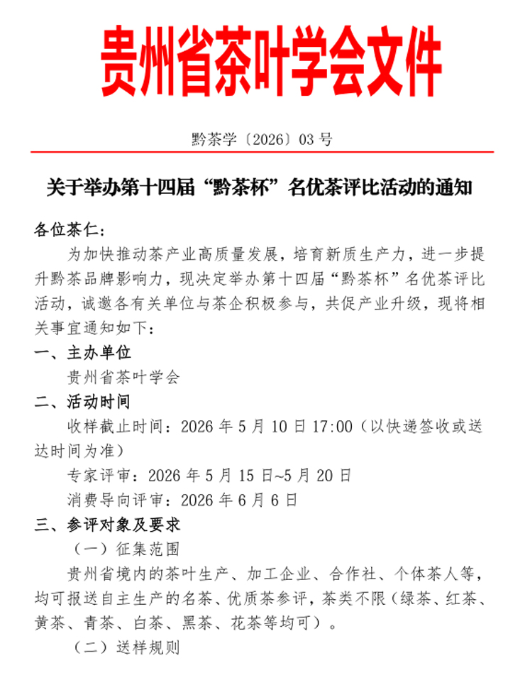 贵州省茶叶学会定于2026年开展第十四届“黔茶杯”名优茶评比活动,送样截止时间为2026年5月10日下午17:00,其它内容详见文件,敬请关注。如您需要帮助,请与我们联系(联系电话:0851-83761125)。
