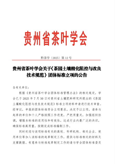 根据相关规定,团体标准《茶园土壤酸化阻控与改良技术规范》标准已立项。请相关单位和个人严把质量关,按期完成标准编制,同时欢迎有关单位参加该标准的起草制定工作。联系人:赵华富17785953391。
