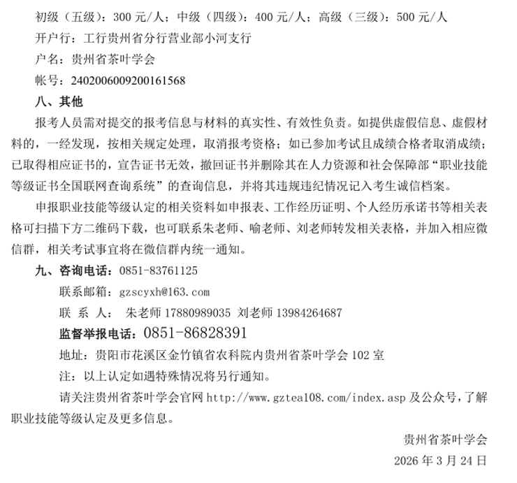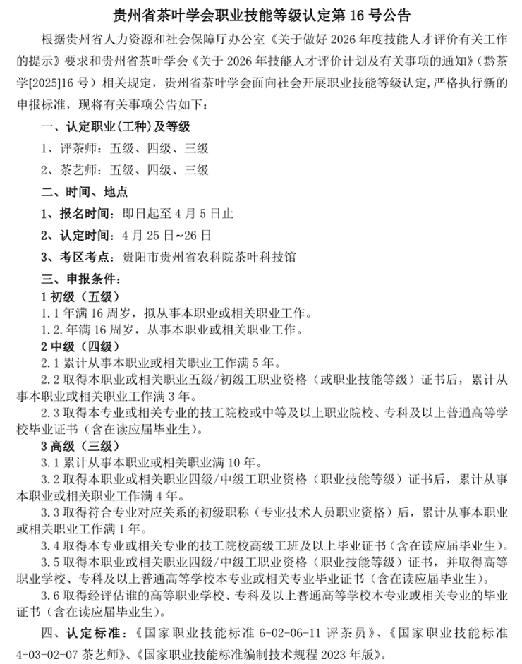 贵州省茶叶学会定于2026年4月25日在贵阳举办评茶师、茶艺师(五、四、三级)职业技能等级认定评价工作,报名截止时间4月5日。现将评价计划及有关事项通知如下,敬请关注