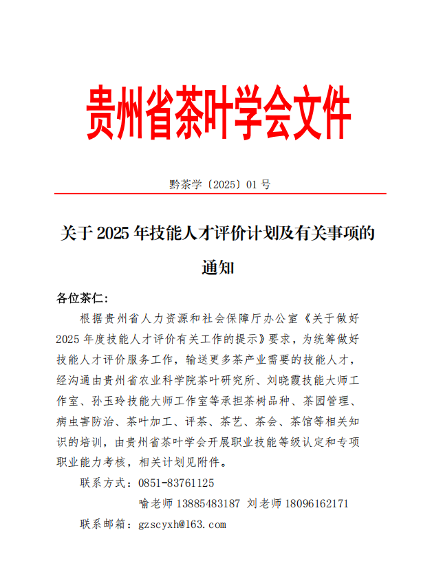 贵州省茶叶学会正在开展2025年技能人才评价报名工作,现将评价计划及有关事项通知如下,详情请见文件,敬请关注。